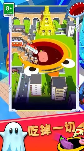1、需要吞噬场景中的建筑、车辆、树木等物体,不断扩大自己的体积。
