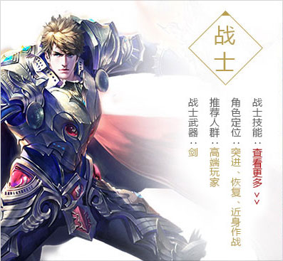 战士拥有过人的体力及华丽的剑术,属于近距离攻击型职业,就算没有其他角色的帮助也有很强的单独生存能力。擅长突进、恢复、复仇和野性暴怒,具有强大的近身作战能力!有着强大体力的战士通常是团队最坚强的护盾,同时也是冲锋陷阵的先锋。