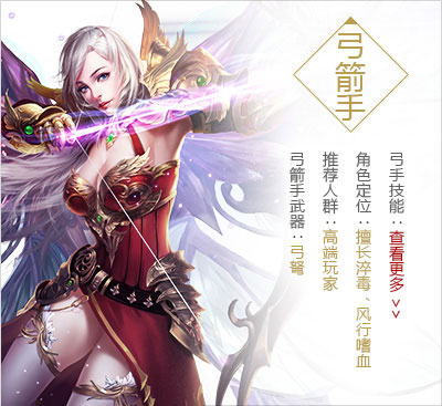 弓箭手族拥有美丽的外貌,主要使用弓箭和弩在远处攻击敌人,擅长淬毒、风行、嗜血、自然领域,具有极其强大的单体输出能力,同时可施放许多有利的辅助技能,是团队中不可或缺的角色。