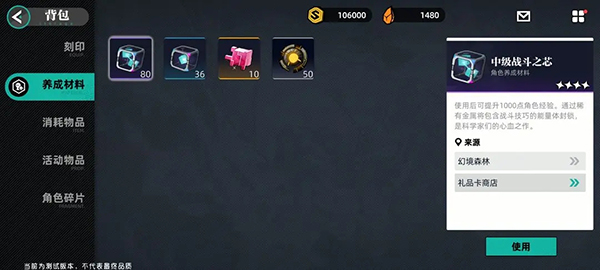 角色升级:升级是通过背包的养成材料[战斗之芯]来升级的。