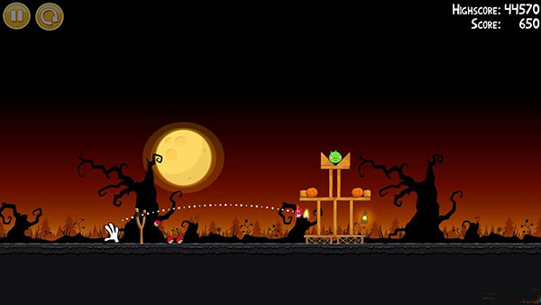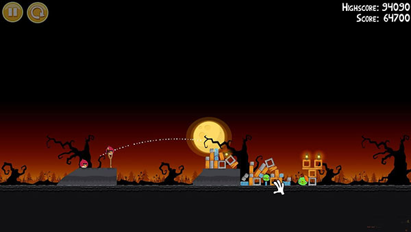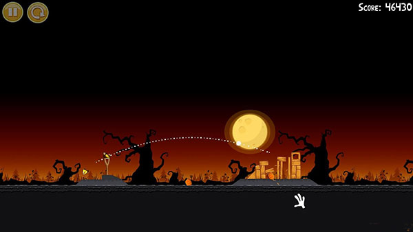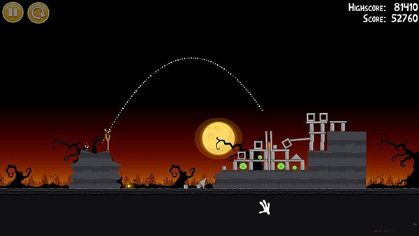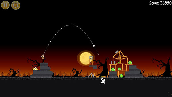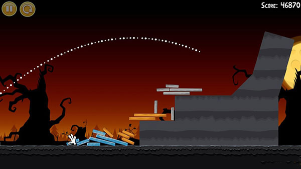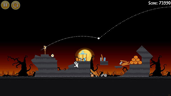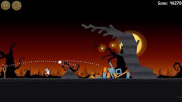 1 - 6:第一只鸟朝着图中的轨迹位置发射,击中了左下角,成功干掉一个南瓜头。第二只鸟同样以特定角度斜着冲向南瓜所在位置。(这里要拿到三星真的超拼人品,我都重复尝试了70多次,简直太苦逼了有木有!)