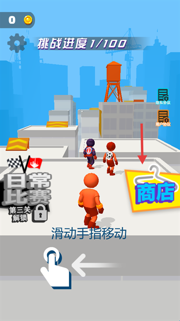 1、主界面按提示【滑动手指移动】-熟悉【商店】等功能-从挑战进度1/100起步推进。极限竞速英雄游戏