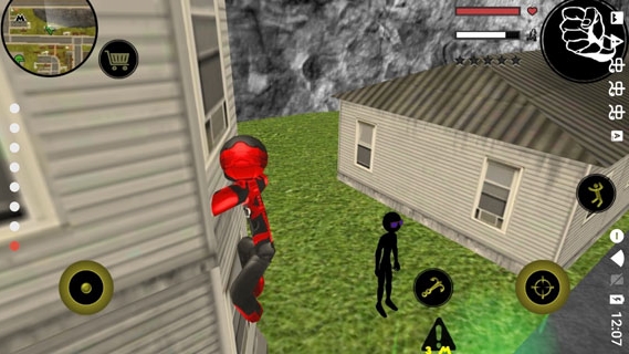 在操作方面,左侧负责移动与加速,右侧控制绳索、攻击(含跳跃动作)以及单纯的跳跃。右上侧区域用于武器更换,同时血量与经验的显示会实时更新,清晰直观。玩家可凭借自由的玩法,与其他帮派人物展开交火。在交火过程中,每成功击杀一名对手就能获得经验,若击杀数量较多,便会产生星级。此时,警察以及附近的其他角色会格外“关照”你,对你发起猛烈进攻。而如何在这场混战中存活下来,并成功击杀其他人物,便是你需要完成的任务。
