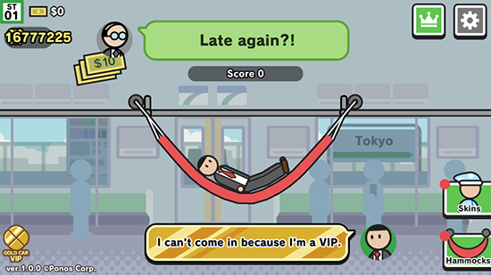 3、进阶玩法:积累金币后,点击右侧“Skins”按钮解锁角色皮肤,或通过“Hammocks”按钮更换吊床颜色,增加游戏趣味性。