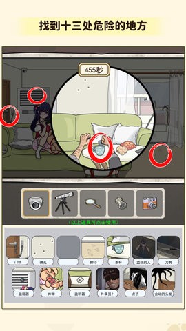 找出不合理合集是款非常不错的益智游戏,该游戏非常适合打发时间,在游戏中,玩家需要在各种场景中找出你认为不合理的地方,每个地方的不合理都会告诉你有几处,只有在规定的时间内找出就算挑战成功,操作简单,老少皆宜,从而让用户拥有更好的游戏体验。