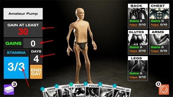 4、右侧则展示了不同部位的肌肉数量,每张卡牌能增加的肌肉量各不相同,合理使用至关重要。