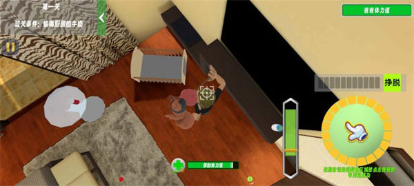 3、被爸爸抓住时扣除体力值,若出现逃脱成功判定,会根据逃脱难度反弹一定体力值,进入疲劳状态;若逃脱失败,减少生命值进度条,并扣除体力值,当体力值归零则游戏失败,可以通过调养来恢复体力。