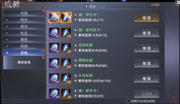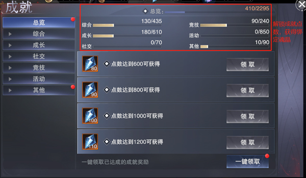 成就系统,是对每位勇士于克兰蒙多世界的历程进行记录的总览。可通过左上角的个人页面,进入成就系统。该系统共分为7个类别,分别为总览、综合、成长、社交、竞技、活动以及其他。每当勇士获取一项成就,便能得到对应的成就点数,当点数累积到一定程度,就能够获取绑定魂晶。
