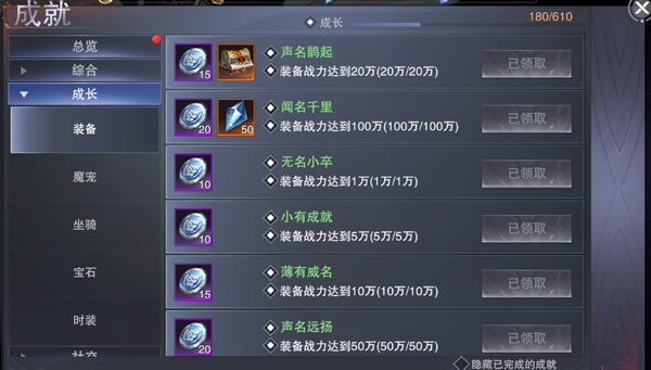成长栏包含装备、魔宠、坐骑、宝石、时装这5个类别。在装备类别中,主要依靠收集装备战力来解锁对应的成就;魔宠方面,则是通过获取不同属性及数量的魔宠来解锁相应成就;至于坐骑、宝石和时装,同样是通过收集不同等阶的对应物品数量,进而解锁相应成就。