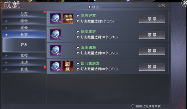 社交栏只有好友数量1项。在克兰蒙多结交不同数量的好友达成解锁相应的成就,获得奖励。
