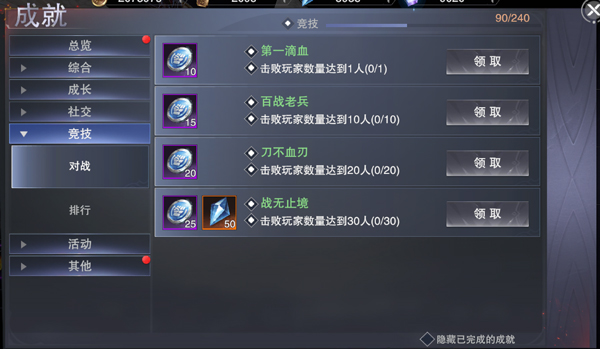 竞技栏分为对战和排行2项。在竞技中击败不同数量的玩家,获得等阶的排行位置,解锁相应的成就。