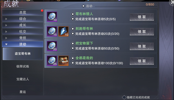 活动栏分为盗宝哥布林、极限试炼、宝藏达人、星运4项。达成相对应的数量,解锁不同的成就。