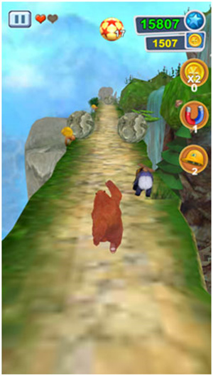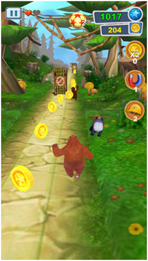 游戏操作简单,跟普通的跑酷游戏差不多,玩家只需向上滑动屏幕,便可控制熊大跑动或者跳跃,越到低障碍时,向下滑动屏幕,便可操控熊大向下滑行躲避障碍。