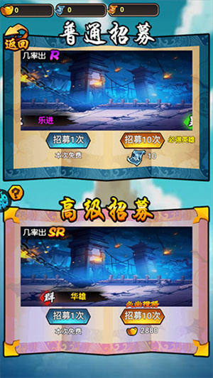 想要获得你心目中的三国名将,就要时常的去“招募屋”溜达溜达。这里分为三个招募手段,三个手段均被加以时间限制的免费次数,只要你时刻关注其中,那么诸多紫色、橙色极品将领的获得就不在话下。
