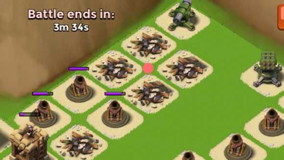 如果对手用野人打你比较多,建议使用躲角阵。顾名思义躲角阵就是将大本营放在最后面的两个角落里,对手用野人的话就要花费大量能量才能走到大本营。将火焰喷射器放在死角,对手用野人爆本就不能震这个火焰喷射器,因为震的话会连野人一起震到,将震爆火箭炮分散摆放且射程覆盖大本营。