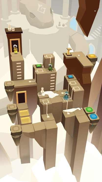 观察场景中颜色标记的砖块与装置,通过转动、拼接等操作使同色方块相连,触发机关开辟通路。