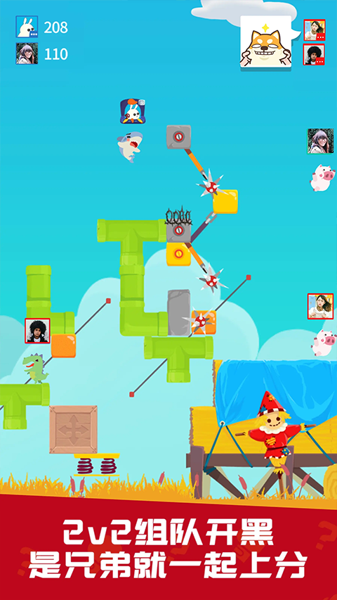 支持 2-4 人同时竞技,有 20 张以上的对战地图随机轮换,还有 2v2 组队模式,玩家可以与好友一起合作或互坑,享受多人对战的乐趣。此外,游戏还有全国对战排行榜,让玩家可以与全国玩家同台竞技。