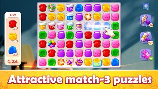 核心消除玩法操作简单,通过滑动手指交换相邻同色瓦片,连成三个及以上即可完成消除。进阶玩法中,四格正方形组合可生成纸飞机特效,五连匹配能解锁强力助推器,合理搭配特效触发连锁反应,可高效突破带障碍的高难度关卡。关卡设有明确收集目标与步数限制,完成挑战即可获取金币、装饰图纸等核心资源。
