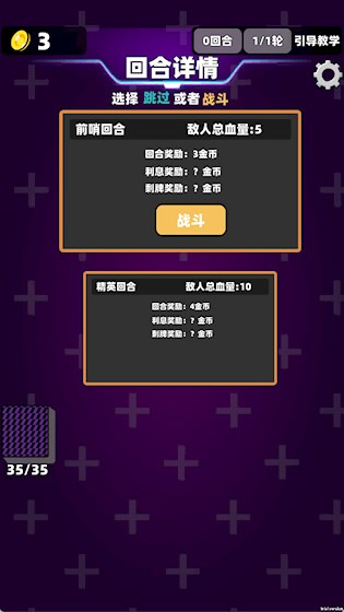 游戏采用关卡制推进,普通关卡可选择跳过,BOSS关卡敌人带有随机增益效果,战胜后可收集对应角色。每轮关卡(共4轮12关)结束后将进入肉鸽商店,消耗战斗获得的金币购买卡包、强化道具等,优化卡组强度,为后续挑战做准备。