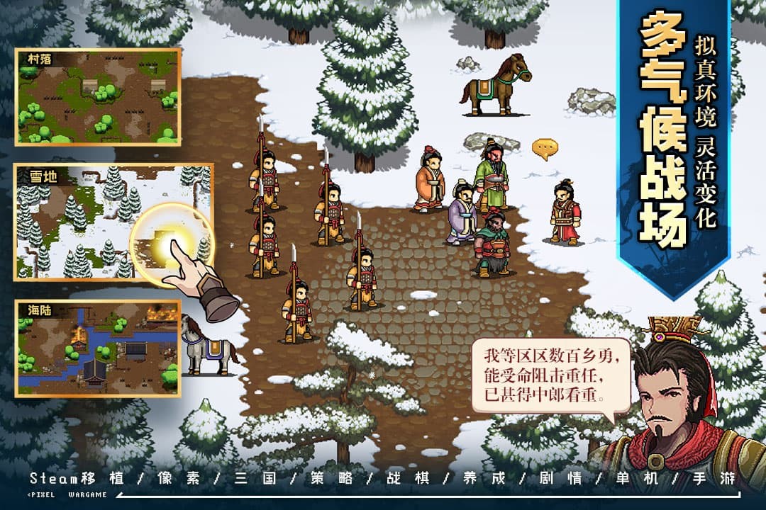 在像素水墨勾勒的三国乱世中,以正史考据为基底推演战棋战术,在人物抉择中塑造文明走向,于多周目探索里解锁多元历史可能,尽享深度策略博弈与沉浸式历史征战的双重乐趣。