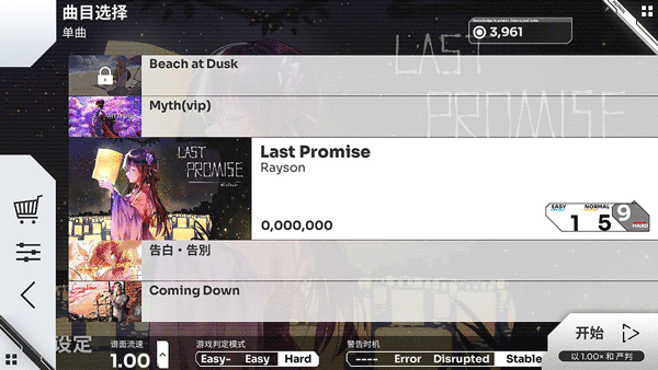 曲目细分多档难度,搭配Easy-、Easy、Hard三种可调整判定区间的游玩模式,判定窗口从±72ms到±150ms不等,既适合新手入门适应,也能满足核心玩家提升底力的挑战需求;游戏本体非商业性质,无强制付费,仅部分曲包和看板需用游戏内货币解锁,存档支持本地流转与QR码备份,保障玩家数据安全。