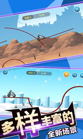 主要分为生涯模式与时间挑战赛两大核心玩法。生涯模式中,玩家需逐步解锁不同地区赛道,完成指定登顶目标获取金币与改装材料;时间挑战赛则要求在限定时间内完成赛道,打破纪录可获得特殊奖励。赛道中需提前观察地形布局,利用跳跃坡道缩短通过时间,避开岩石、沟壑等障碍,部分关卡还设有 checkpoint,即使坠落也可返回 checkpoint 继续挑战。