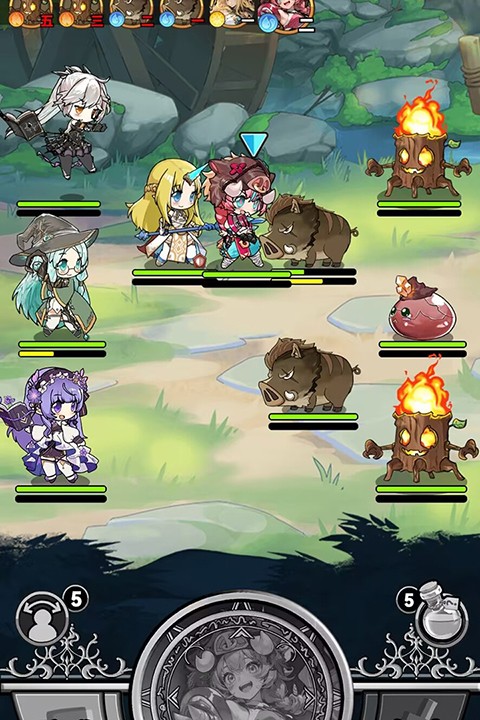 采用五人回合制战斗,角色属性存在明确克制关系(水→火、火→木、木→岩、岩→水、光⇔暗),前排坦克+后排输出的站位设计考验阵容搭配。更有跨属性合体技机制,特定角色同时上阵可触发强力群体技能,战斗中还需利用场景元素破局,打破“站桩输出”的传统模式。