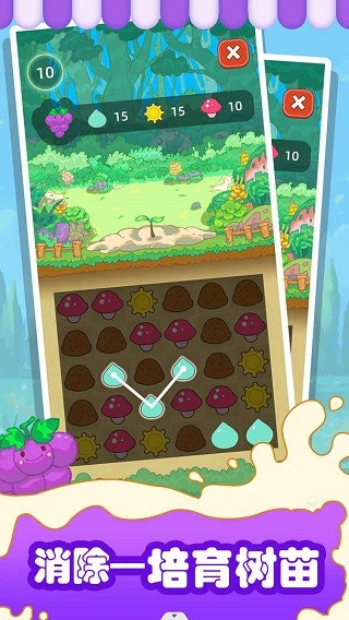 核心消除玩法简单易懂,通过单指连线相同图案的方块即可完成消除,成功消除后可获得土壤、水分、光照、肥料等育苗资源。消除过程无时间压力,玩家可从容规划连线策略,连续消除还能提升资源获取效率,为果树培育提供充足保障。