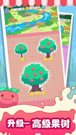 利用消除获得的资源进行育苗,将培育好的果苗种植在果园中,等待果实成熟。通过升级果树可加快成熟速度、提高果实产量与售价;积累足够金币后,可解锁更多果园区域,购置灌溉设施、存储仓库等经营道具,同时招募水果猎人协助采摘,提升果园的整体经营效率。