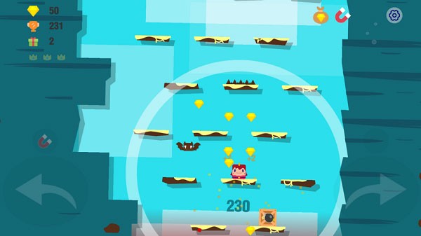 在不断向上跳跃的过程中,需灵活躲避火炮、蝙蝠、陷阱等各类障碍物,同时尽可能收集沿途的金币与宝石。部分关卡设有通关节点,抵达节点即可完成当前阶段挑战,解锁更高难度的后续层数;攀升的层数越高,获得的评价与奖励越丰厚。