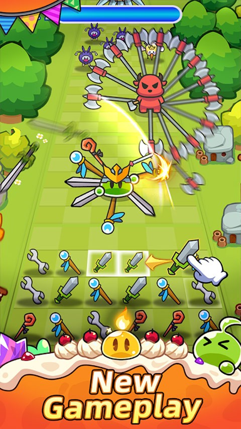 拥有清晰的合成逻辑,基础物品对应特定英雄类型,如弹弓合成投蛋手、法杖合成冰霜法师、触手合成小恶魔等,合成后英雄的攻击力、攻击范围等属性将显著强化。同时支持五消进阶升级,搭配“拖拽移除”创新功能,可灵活调整站位避免死局,玩家能根据战场局势自由规划合成顺序与阵容搭配,打造专属强力军团。