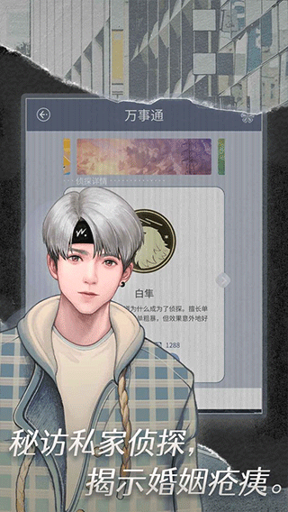 切换匿名小号窥探丈夫隐私,利用“万事通”APP对身边人物(丈夫、闺蜜、追求者等)展开调查,挖掘他们不为人知的过往与秘密,收集解谜所需的线索。