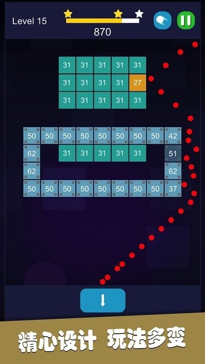 主线为关卡式闯关,玩家需通过滑动或点击屏幕,控制弹珠发射角度或底部弹板移动,借助物理反弹原理击碎画面中的所有砖块即可通关。部分砖块需多次撞击才能击碎,若弹珠漏接或砖块触及底线则挑战失败。通关过程中,玩家需精准预判弹珠反弹轨迹,合理利用砖块布局提升击碎效率。