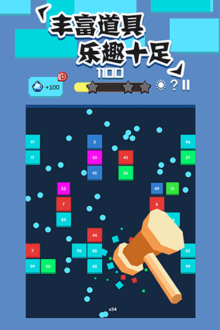 主线为关卡式推进,玩家长按屏幕瞄准方向,松手发射小球,或操控底部挡板反弹小球,击碎所有砖块即可通关。砖块设有耐久度,部分需多次撞击,发射后砖块会缓慢下移,需加快清除节奏避免失败。