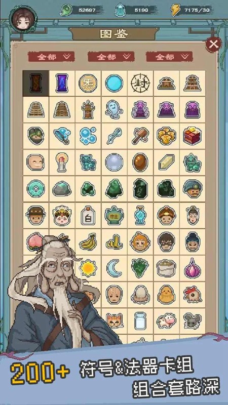 开局自带20余种基础符号,玩家可在行囊中升级符号提升效果,也能通过挂机升级后前往知天阁购买更高级的符号与法器,不断优化卡组的联动效率与输出能力,解锁专属流派。