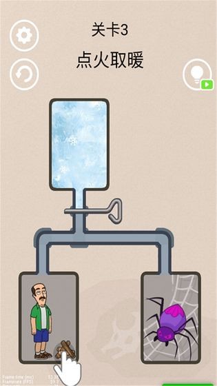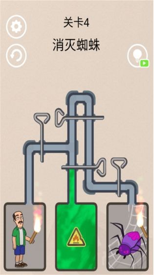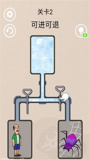 每局关卡中,老人与蜘蛛被管道和销子分隔在不同区域,上方设有释放冷冻气流的源头。玩家需用手指滑动屏幕,拔动对应销子或调整阀门方向,接通冷冻气流的传输路径,引导气流精准流向蜘蛛所在区域,将其冰封即可完成核心目标,过程中需避免气流误触老人区域。