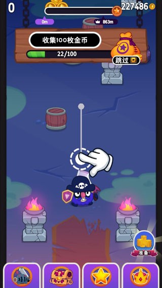玩家选择角色进入关卡后,通过点击滑动屏幕控制角色利用吊绳进行弹射移动。在移动过程中,需躲避炸药桶、移动地雷、石墩墙壁等障碍物,同时瞄准哥布林、士兵、黑暗巫师等敌人发起攻击。击败敌人、收集关卡内的金币与道具即可获得通关积分,积分达标可解锁星级评价,进而开启后续关卡与特殊奖励。