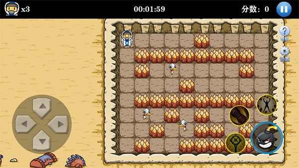 根据所选主题明确任务目标,建筑拆除主题需在指定条件内(如最少炸弹数量)完成建筑坍塌,宇宙主题需摧毁指定星体或清空星区,迷宫主题需通过爆破开辟道路、消灭敌人并找到出口。操作时通过左侧摇杆移动至目标位置,点击右侧按键放置炸弹或使用破坏武器,随后迅速撤离至安全区域,避免被爆炸气浪波及;部分关卡需避开巡逻敌人或危险单位(如小鸭子),提升通关难度。