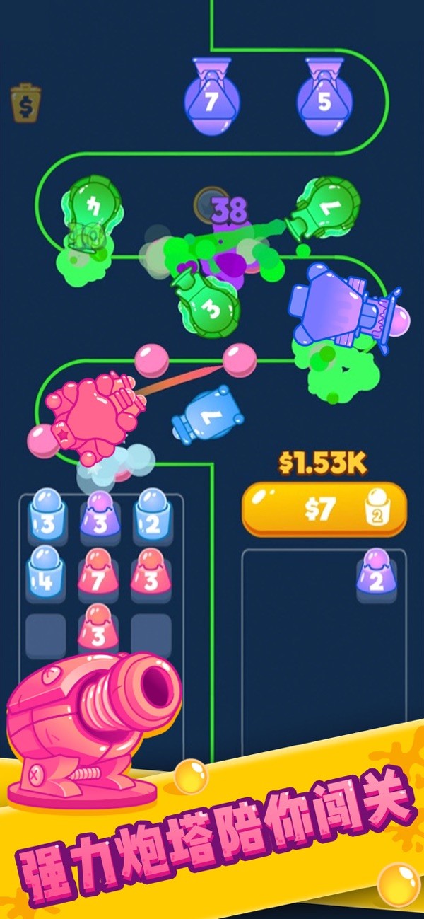 打破传统塔防的单调攻击模式,将颜料炮弹与炮塔攻击相结合,搭载色彩物理引擎,发射的颜料会涂鸦式铺满屏幕,泡泡怪兽被击中后会伴随颜料飞溅效果,视觉冲击力十足。真实的流体动态与光影折射效果,搭配动感背景音乐,让玩家在阻挡敌人的同时,既能享受策略布局的成就感,又能通过色彩涂鸦释放生活压力,解压感拉满,实现“玩游戏=放松身心”的核心体验。