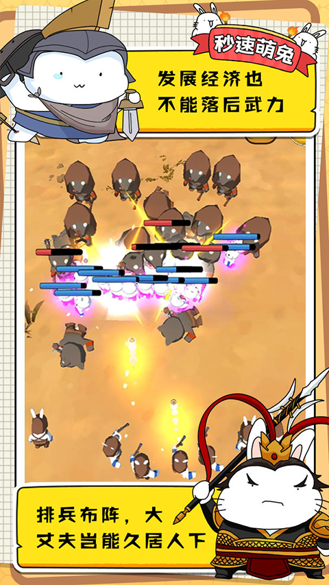 设有轻度策略RTS战斗机制,萌兔兵种分为步兵、弓兵、骑兵、炮兵、重弩等多种类型,各兵种存在明确相克关系,玩家需根据战场形势、敌人配置合理排兵布阵,搭配伟兔专属技能,巧用地形优势击败敌人。战斗难度层层递进,既有简单关卡适合新手,也有高难Boss战与副本挑战,兼顾休闲性与策略深度,输赢全凭搭配与布局,无需担心数值碾压。