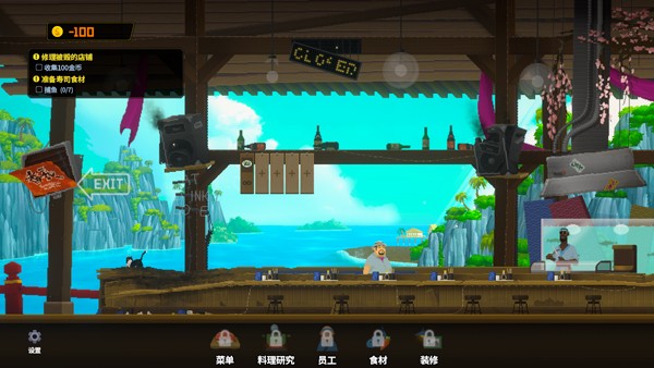 将白天捕获的海洋生物进行处理,作为寿司店的核心食材,根据鱼类种类与星级,研发不同口味的寿司菜品(共50多种),菜品等级越高、食材越稀有,售价越高、口碑越好。可通过强化料理提升菜品属性,解锁专属CG动画,进一步提升收益与客流量。