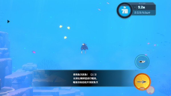 潜水时需重点管理氧气,氧气与血量二合一设计,加速游动、遭遇攻击会加速消耗氧气,氧气耗尽会丢失全部收获并被迫上浮,可通过拾取海底氧气罐、升级氧气瓶延长潜水时间。探索过程中需躲避海洋生物攻击与陷阱,同时可挖掘隐藏遗址、破解小型谜题、拾取宝箱,获得武器蓝图、装备材料、宝藏等奖励,部分隐藏内容需通过特定武器(如升级后的小刀敲动矿脉)解锁。
