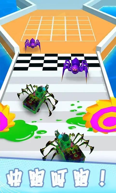 玩家通过左右滑动屏幕操控蜘蛛火车的行进方向,在赛道中快速飞驰,途中需灵活躲避轨道上的各类障碍物,包括旋转机关、伸缩墙、锤子、电锯、塌方碎石等,确保火车持续前进不被淘汰;同时收集赛道上散落的能量方块,每收集一个即可为火车增加一节车厢,进而提升火车的整体长度、速度与战斗力;部分关卡需在规定时间内抵达终点站,并通过撞击方式摧毁最终关卡的守卫列车,完成闯关挑战,解锁后续内容与更高难度关卡。