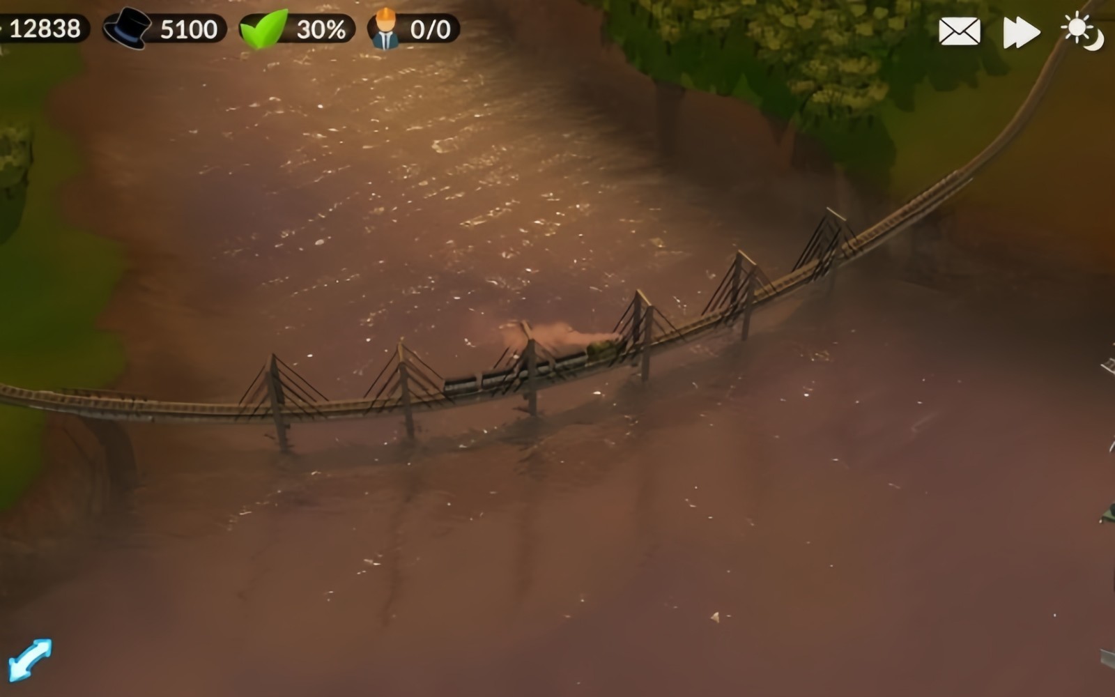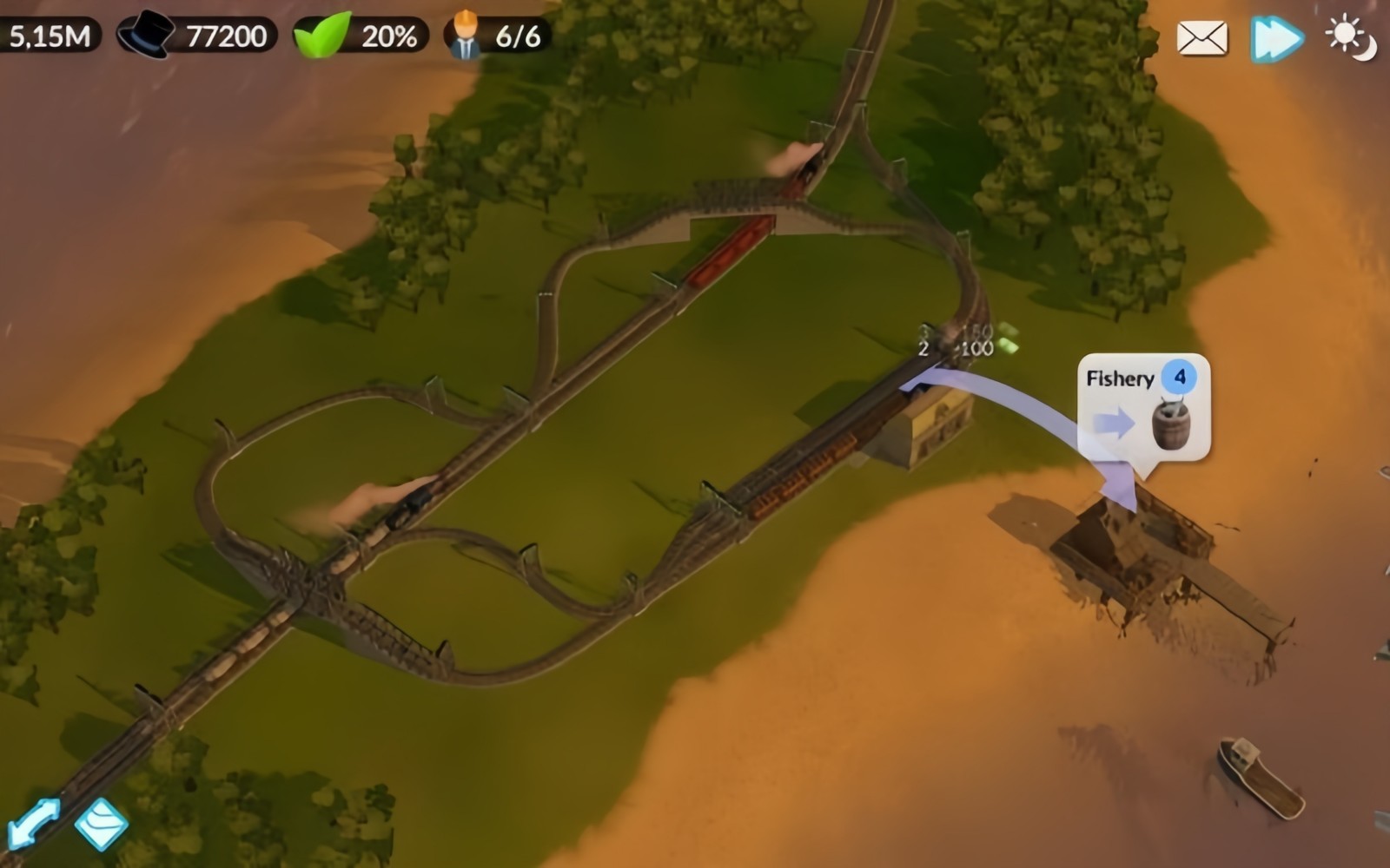 游戏开始时,你需要选择一个起点城市和一个终点城市(如煤矿站和小镇站),点击屏幕右侧的轨道图标,在两者之间绘制铁路线。轨道铺设完成后,进入火车管理界面,选择一个引擎(车头),并根据运输需求挂载相应的车厢(如煤车、客车)。设置好运行路线后,你的首趟列车便可以正式启航,将物资运送到目的地。
