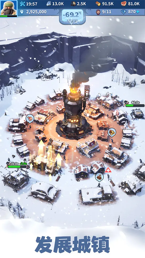 作为镇长,玩家的首要任务是发展城镇。大熔炉是城镇的核心建筑,其等级限制了其他建筑的等级,因此优先升级大熔炉是重中之重。此外,为了应对幸存者生病的问题(通常因工作环境温度过低或工作时间过长导致),玩家需要开启大熔炉至最大功率以提高温度,并合理安排幸存者的作息,缩短夜间工作时长。资源管理同样关键,食物、煤炭、生肉等资源需要通过派遣部队占领野外的高级资源点进行采集,资源点等级越高,产出越丰富,但也需要更强的兵力去防守。