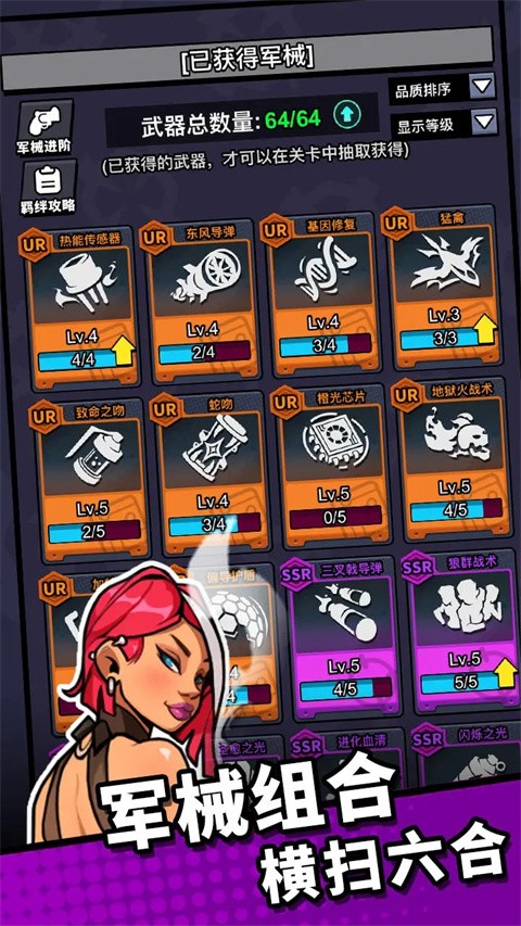 在局外的备战界面,玩家需要进行核心的阵容构建。点击军械库,你可以查看已拥有的64种军械。建议新手玩家先从基础的枪械流派开始尝试,例如搭配“加特林”与“卫星狙击”等核心武器。当你装备了特定的军械组合后,屏幕上方会显示已激活的羁绊效果。例如,当你装备了足够数量的“枪械”类军械时,会激活“枪械”职业羁绊,提升全队的射击伤害;若装备了“三角洲”系列的军械,则可能激活部队羁绊,获得暴击率加成。随着游戏进程的深入,你可以尝试将武器升至满星,解锁其专属特效,进一步提升战斗力。