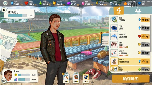 成长离不开技能的掌握。玩家通过消耗“悟性”来学习新技能,每个技能都与特定的属性相关联。例如,想要降低某个体育技能的悟性需求,就需要先提升“力量”属性。提升属性的主要途径是“脑洞地图”小游戏。在脑洞地图中,玩家需要连接神经元,每点亮一个神经元就能获得对应的属性加成。由于点数有限,玩家必须根据自己的人生规划,优先点亮对当前目标最有帮助的属性分支。这种机制鼓励玩家进行策略性思考,是优先发展学业成为学霸,还是提升社交属性成为校园风云人物,选择权完全在你手中。