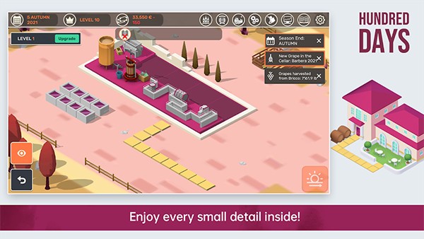 采摘后的葡萄进入酿造环节。首先进行破皮压榨,红葡萄酒需要带皮发酵以提取单宁,而白葡萄酒则需先压榨再发酵。在发酵阶段,你需要选择合适的酵母(天然酵母或实验室培育酵母)并控制发酵周期。进阶玩家可以利用“搅桶”工艺增加酒体复杂度,或通过“乳酸发酵”来柔化尖锐的酸度。发酵结束后,陈化是提升酒质的关键,你需要解锁木桶设施,选择橡木桶的类型(大桶、小桶、椭圆形桶)和烘烤程度,酒液在桶中存放的时间越长,酒体越厚重,单宁也越柔顺。
