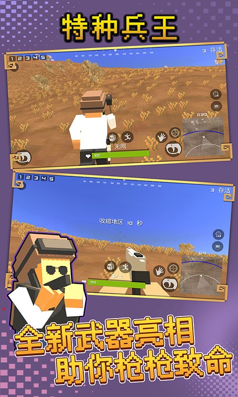 特种兵王是一款动作射击类游戏。游戏背景设定在一个充满挑战的特种作战世界,玩家将化身为一名造型可爱的Q版特种兵,在看似萌趣实则危机四伏的战场上,展开一场场关于智慧与枪法的较量。玩家扮演的角色空降在一座荒岛上,开局手无寸铁,必须迅速适应环境,搜寻物资,武装自己。在不断缩小的安全区(毒圈)内,利用地形与策略,击败所有对手,最终证明自己是当之无愧的“特种兵王”。游戏不仅包含了紧张刺激的单人求生,还提供了多人对战模式,让玩家在享受搜刮、发育乐趣的同时,也能体验到与真人玩家斗智斗勇的竞技快感。