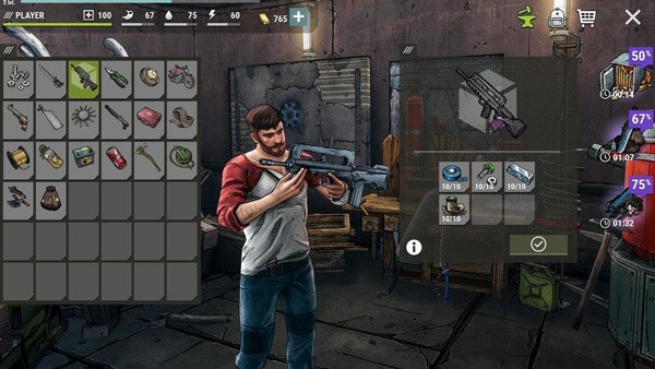 近战(撬棍、砍刀)、远程(枪械、改装武器)、陷阱,搭配装备系统(8 格装备位,属性叠加)。